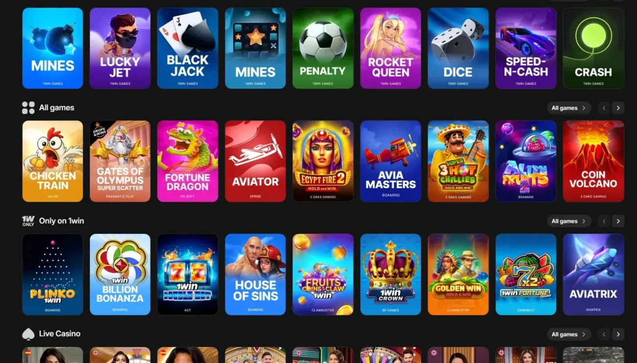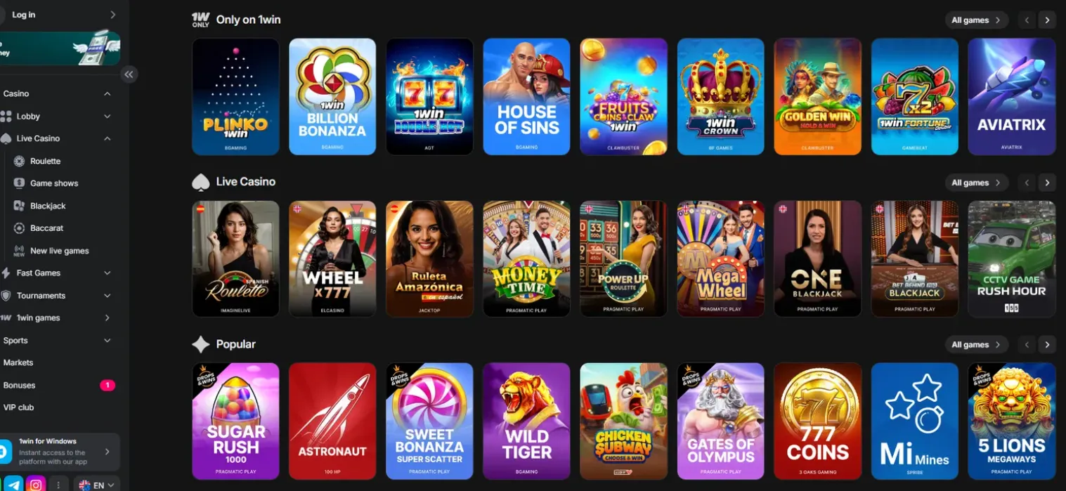 Nuestro análisis funcional detectó que 1win mezcla títulos de proveedores líderes con secciones marcadas como “Originals” o exclusivos para la casa. Estos títulos exclusivos suelen ser relanzamientos o skins de mecánicas conocidas (slots de 5x3, minijuegos crash), empaquetados con diseños impactantes para el mercado latinoamericano.